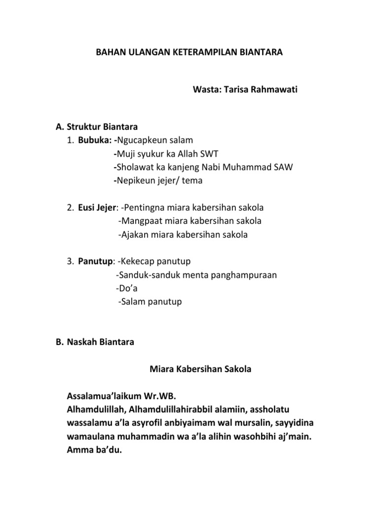 Pembahasan Ditilik tina suasanana aya dua rupa biantara nyaeta biantara resmi jeung biantara teu resmi. Struktur biantara nyaeta salam bubuka pangbagea bubuka eusi panutup salam panutup. Upama ditilik tina eusi jeung adeganana biantara téh diwangun ku tilu bagéan nya éta.